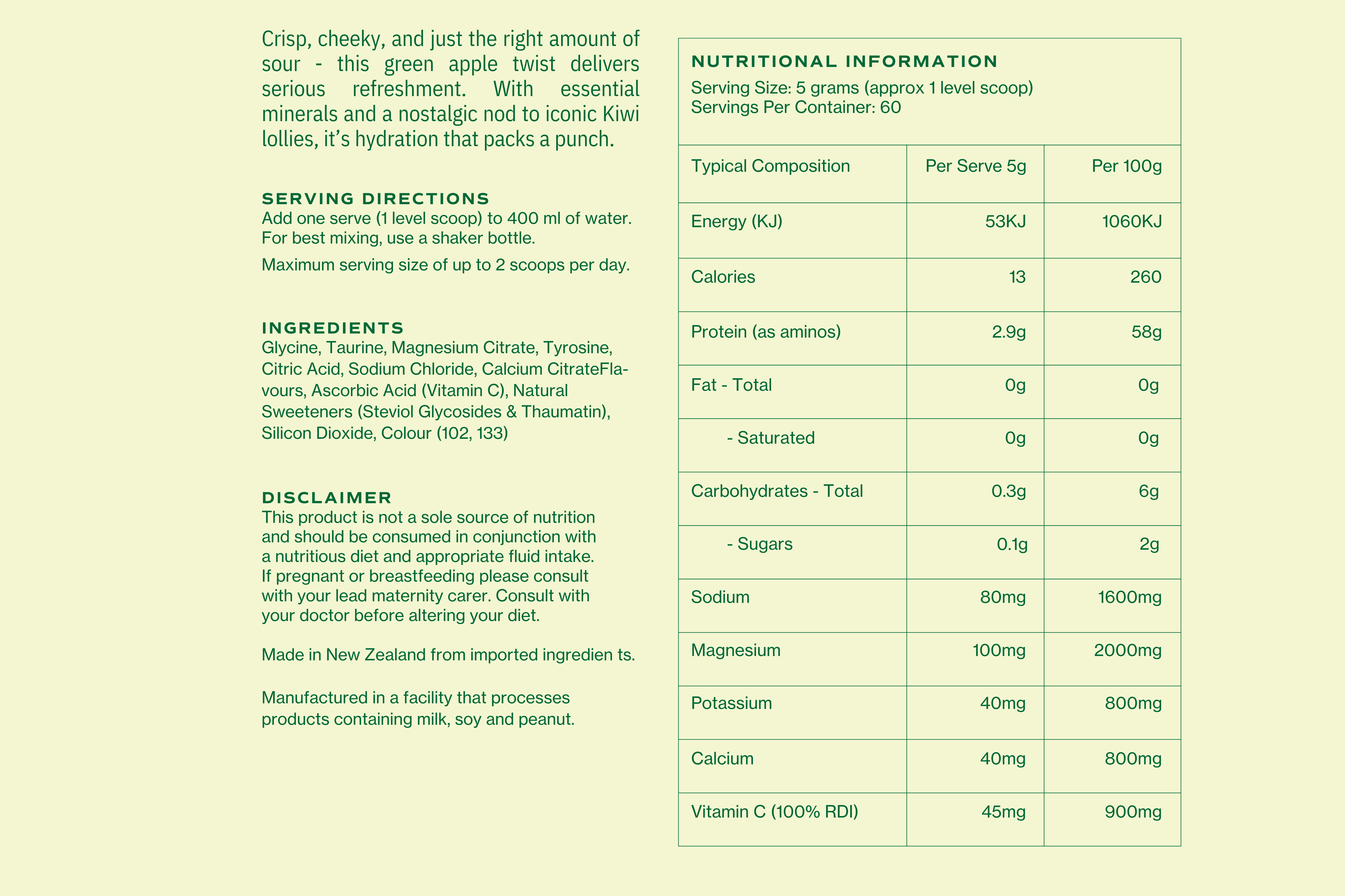 Inspired by the iconic Kiwi lolly Tangy Fruits, our Tangy Green Apple Electrolytes deliver crisp, energising flavour with a juicy bite. It’s the same electrolyte formula you know and love - now with a fun, nostalgic twist.