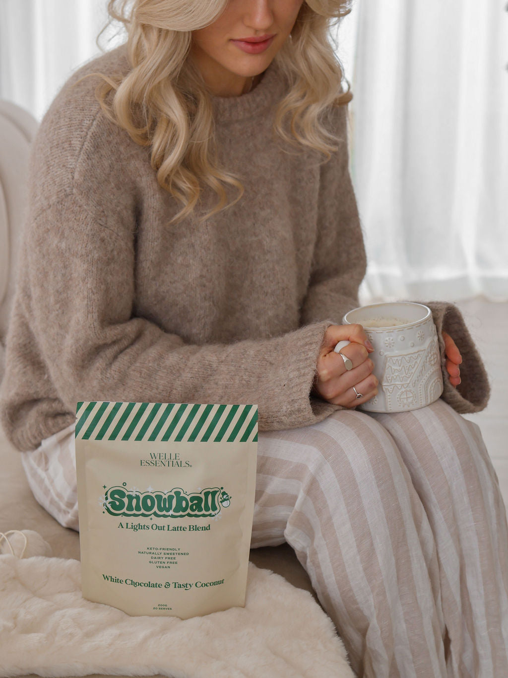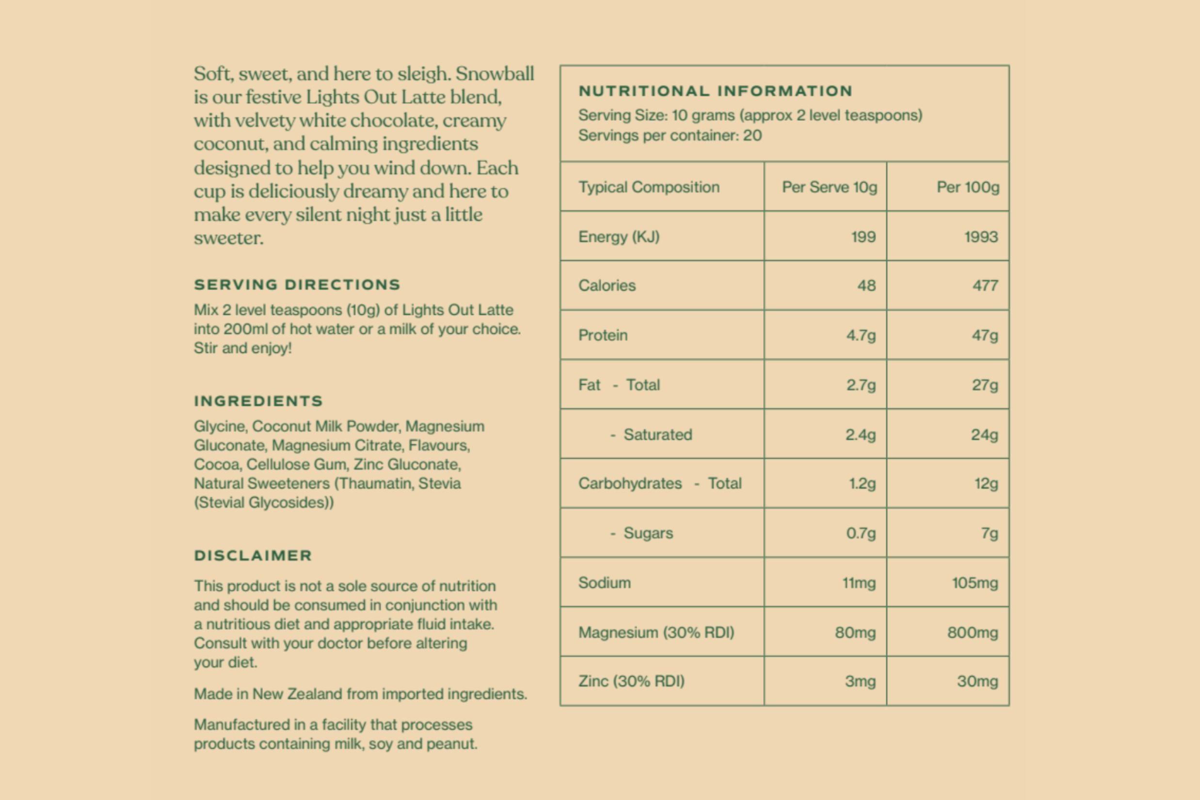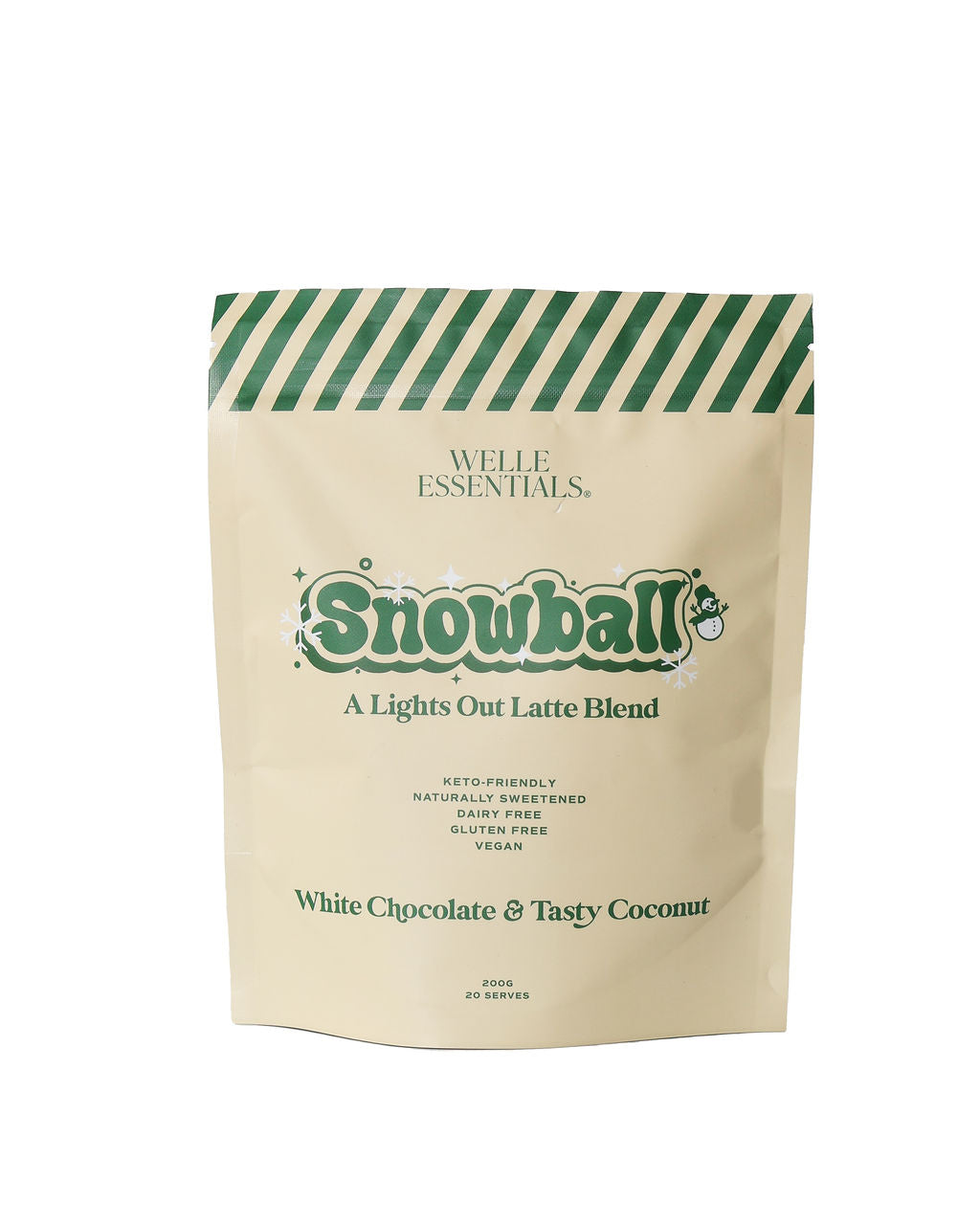 Snowball is your cosy cue to slow down - a creamy blend of white chocolate and coconut that tastes like dessert, minus the sugar crash. It’s our seasonal Lights Out Latte, made with magnesium and zinc to help you relax and reset when you need it most.