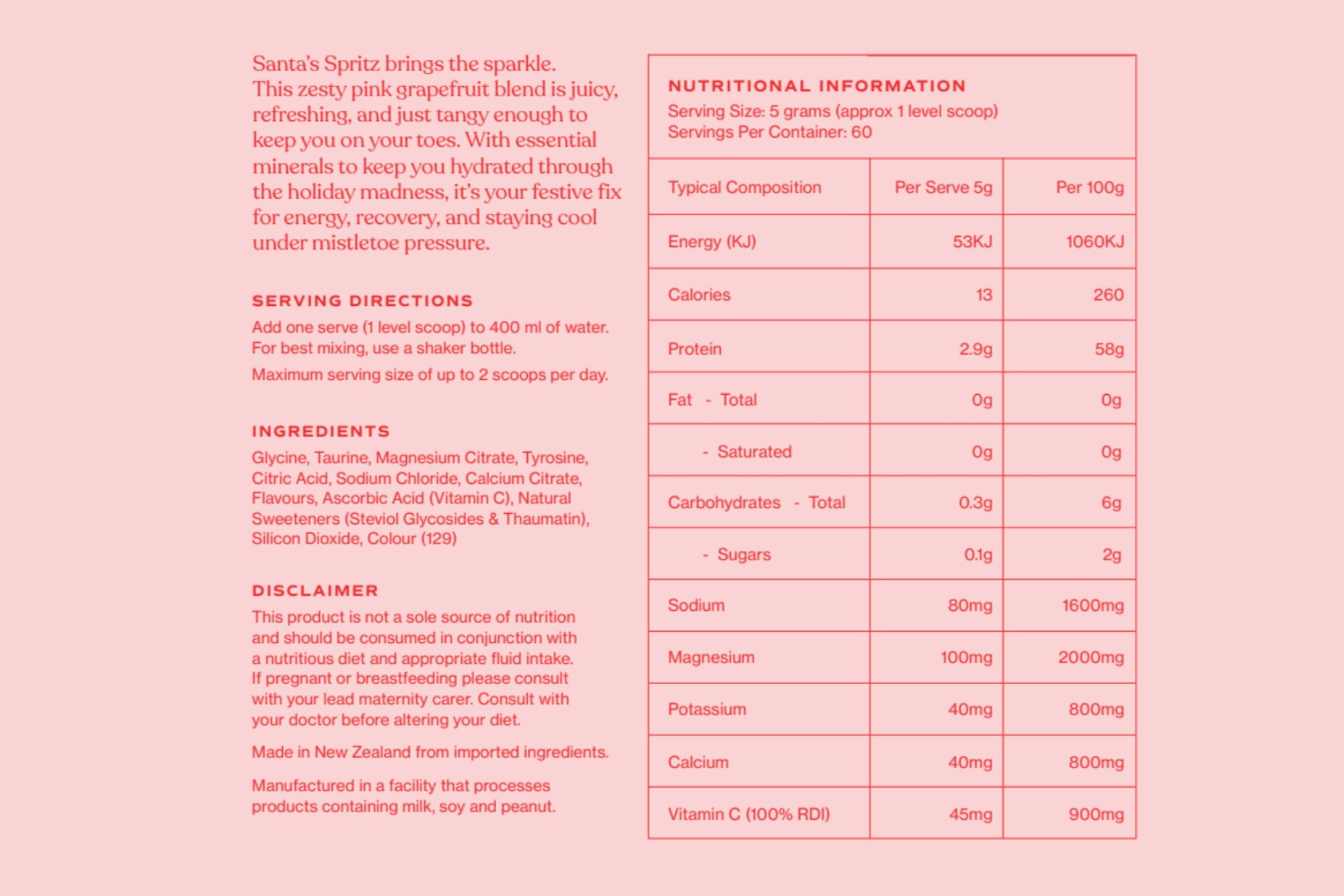 Our festive pink grapefruit blend brings a bright, refreshing twist to your daily hydration. Whether you’re tackling a workout or just need a little lift navigating the Christmas chaos, Santa’s Spritz is your go-to for feeling good.